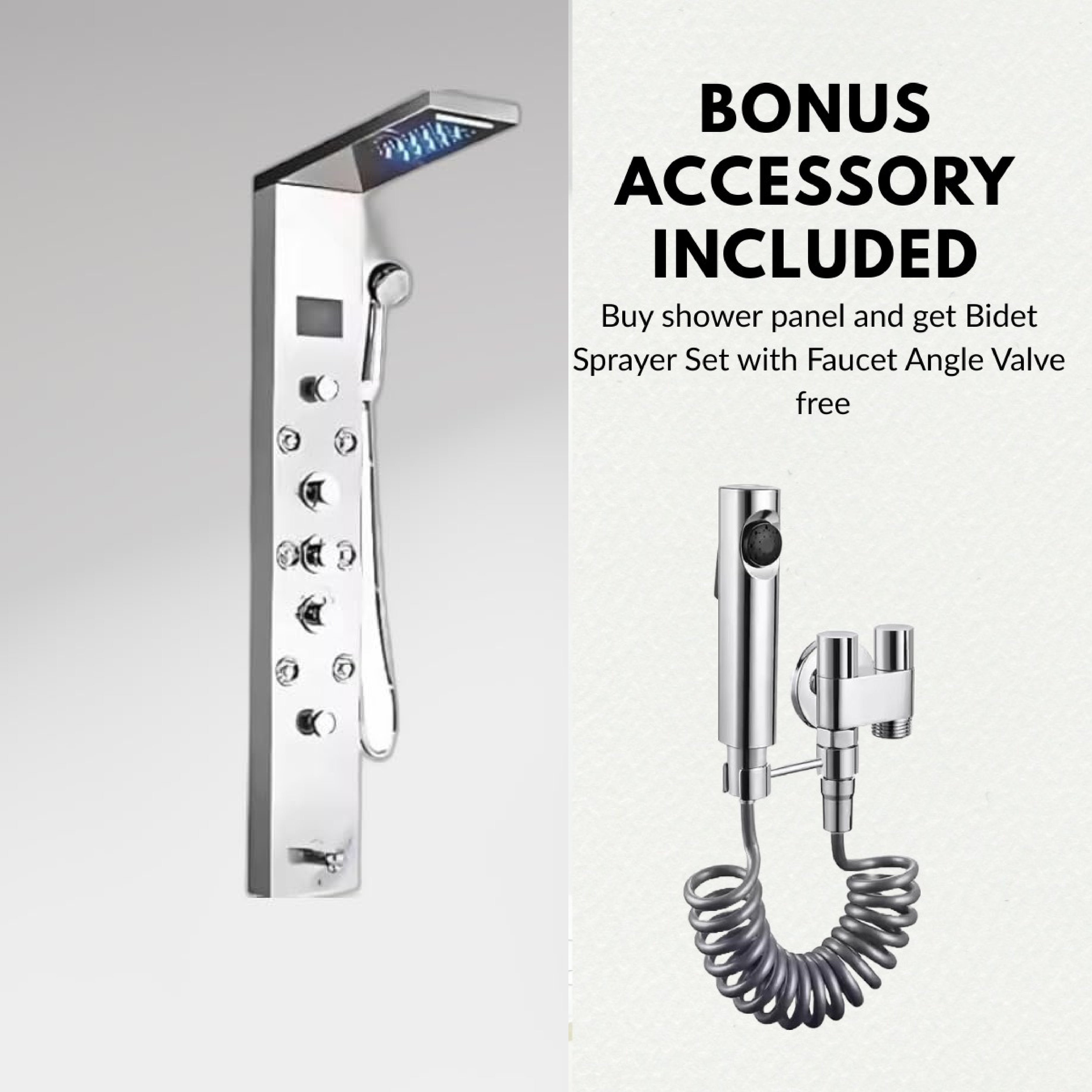 Transform your bathroom into a luxury spa with this premium Shower Panel featuring an LED temperature display for precise control and modern convenience. Crafted from durable SS 304 stainless steel with a sturdy 1 mm thickness, it ensures long-lasting performance and is available in elegant mirror or brushed finishing. Designed for a complete showering experience, it includes an overhead shower, hand shower, waterfall shower, spout, and body jet massage functions for ultimate relaxation. Equipped with 8 brass body jets containing 64 precision nozzles, it delivers a powerful massage spray supported by a 1 HP pressure pump for consistent high water pressure and maximum comfort. Combining advanced technology, durability, and style, this shower panel is the perfect upgrade for a modern luxury bathroom.