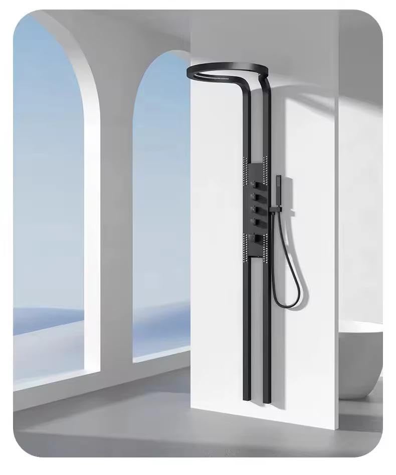 Transform your daily shower into a luxurious spa experience with this premium ZeeCry shower panel system. Crafted from high-grade 304 stainless steel with a sophisticated matte black finish, this 2200mm wall-mounted shower tower delivers exceptional performance and style. The innovative air-supercharging technology ensures powerful water flow while optimising water consumption. Features include a stunning waterfall rainfall showerhead, comprehensive body spray jets with 60 nozzles for full-body coverage, and precise temperature control through a refined copper valve core. The dual-control system offers perfect hot and cold water adjustment, while the self-cleaning silicone water outlets ensure lasting performance. The thoughtfully designed upper and lower back spray provides thorough coverage, creating a water curtain that envelops your entire body. Installation is straightforward with the included mounting kit, compatible with standard plumbing systems. For optimal performance, a 1 HP pressure pump is recommended. The sleek 550mm width and 180mm depth dimensions make it suitable for most bathroom spaces, while the durable construction ensures long-lasting reliability.